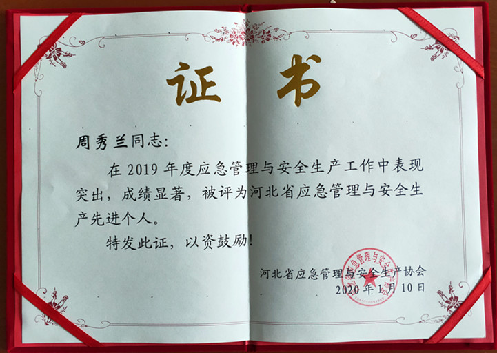 近日,我公司被河北省應急管理與安全生產協會評為2019年度河北省應急管理與安全生產先進單位,我公司曹云輝、周秀蘭同志被評為2019年度河北省應急管理與安全生產先進個人。